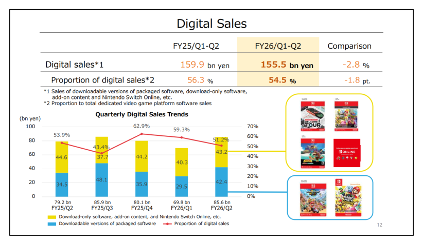 Доля продаж игр в «цифре» составила 54,5 % — это на 1,8 процентных пункта меньше, чем годом ранее, а также ниже на 4,8 процентных пункта по сравнению с предыдущим кварталом.