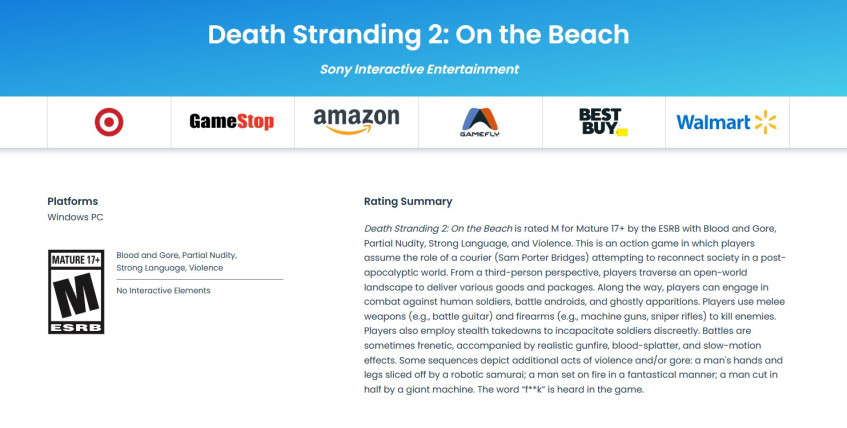 Sony совершенно точно отпустит Death Stranding 2: On the Beach на ПК. В этом нет сомнений. Но когда именно это произойдёт — загадка, терзающая умы ПК-бояр. Наконец появился первый маркер грядущего порта. 26 ноября агентство ESRB выдало сиквелу возрастной рейтинг для народной платформы.
