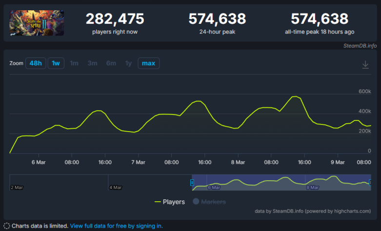 На прошлой неделе долгожданная Slay the Spire 2 стартовала в раннем доступе Steam и в мгновение привлекла обширную аудиторию. На этом достижения игры не закончились — за прошедшие выходные она отметилась пиковым онлайном в 574 638 пользователей, что является новым рекордом для всего жанра Roguelike.