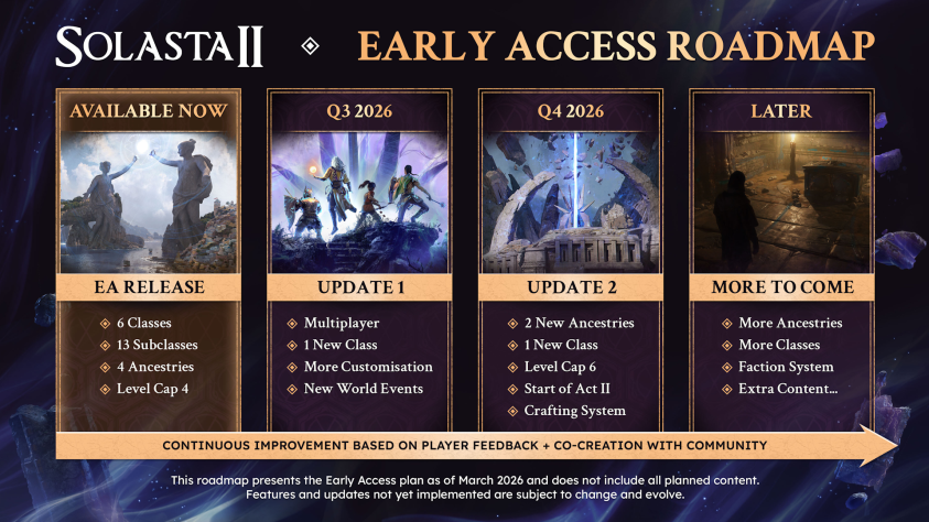 На запуске разработчики предлагают первый сюжетный акт, шесть классов с тринадцатью подклассами и четыре происхождения. Прокачка пока ограничена четвёртым уровнем. Актуальный план контентных обновлений выглядит так: