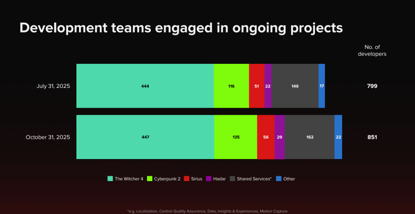 Общее число занятых в CDPR разработчиков — 851 человек. Количество увеличилось на 6,5 %, если сравнивать с июлем 2025-го. Все команды нанимали себе больше людей.