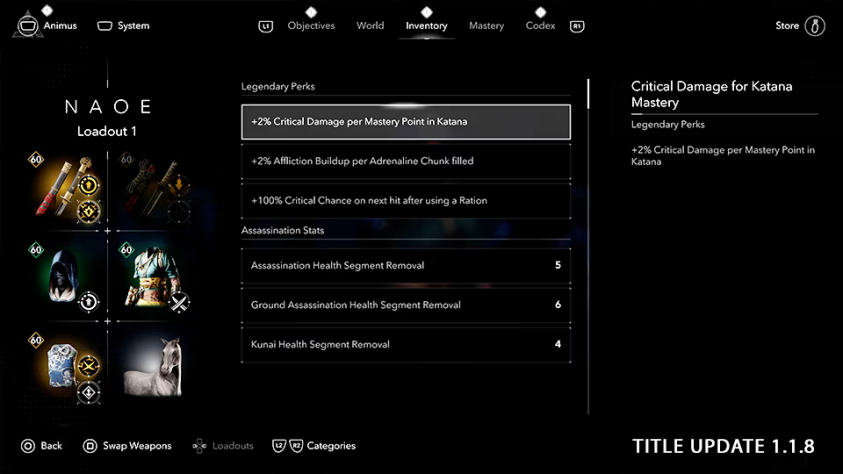 Добавят подробное описание экипировки и перков. Чтобы его открыть, достаточно будет зайти в меню инвентаря и нажать правый стик на геймпаде или Tab на клавиатуре.