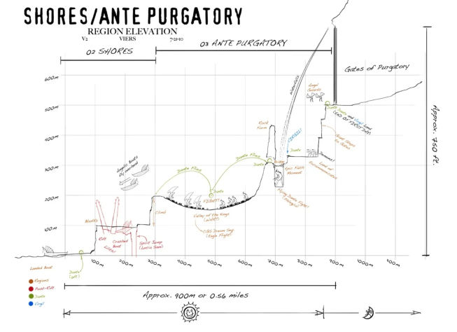 Для перехода между террасами Данте приходится карабкаться по отвесным скалам. Как заявляют сами разработчики, они хотели реализовать «лучшую игру про скалолазание — лучше Uncharted или Tomb Raider». Прохождение уровней было бы похоже на решение головоломок: игроку нужно было искать выступы, избегать осыпающихся камней и атак врагов на расстоянии, а также помогать компаньонам. В середине сюжета Данте получает способность, которая позволяет ему видеть ранее недоступную «ангельскую архитектуру» и открывать новые пути.